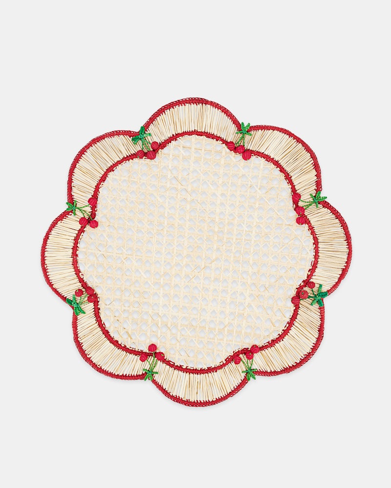Estos manteles individuales de rafia plasman a la perfección el espíritu desenfadado del verano. Están cuidadosamente tejidos con materiales naturales y decorados con unas preciosas cerezas —rojas, en este caso—, que añadirán un toque alegre a tu vajilla.