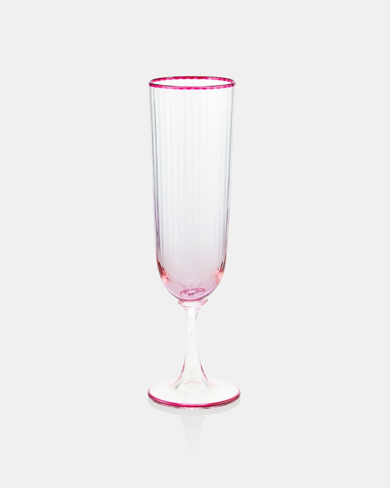 Celebra cualquier ocasión con nuestra exquisita Copa de Flauta a Rayas. Elaborada artesanalmente, de forma magistral, con cristal de Murano soplado de forma artesanal y cuidando hasta el más mínimo detalle, en tono rosa amatista, el tallo va rematado con un elegante borde dorado.