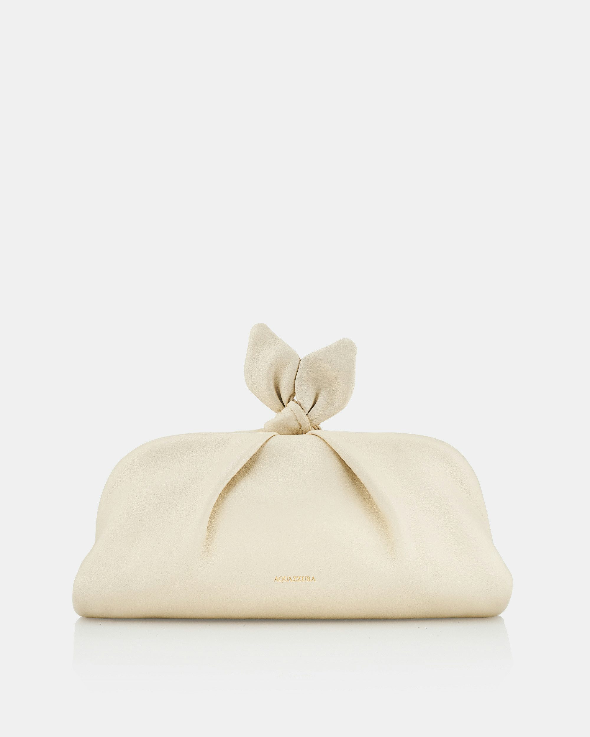 Inspirado en el coqueto lazo que adorna los zapatos epónimos de Aquazzura, este Bow Tie Clutch está elaborado en suave cuero nappa blanco 'Latte', suavemente plegado y atado sobre un elegante marco metálico. Una actualización contemporánea de la clásica bolsa estructurada, este bolso compacto lleva un logo en tono dorado claro y una delgada correa de cadena metálica que se guarda en su interior.