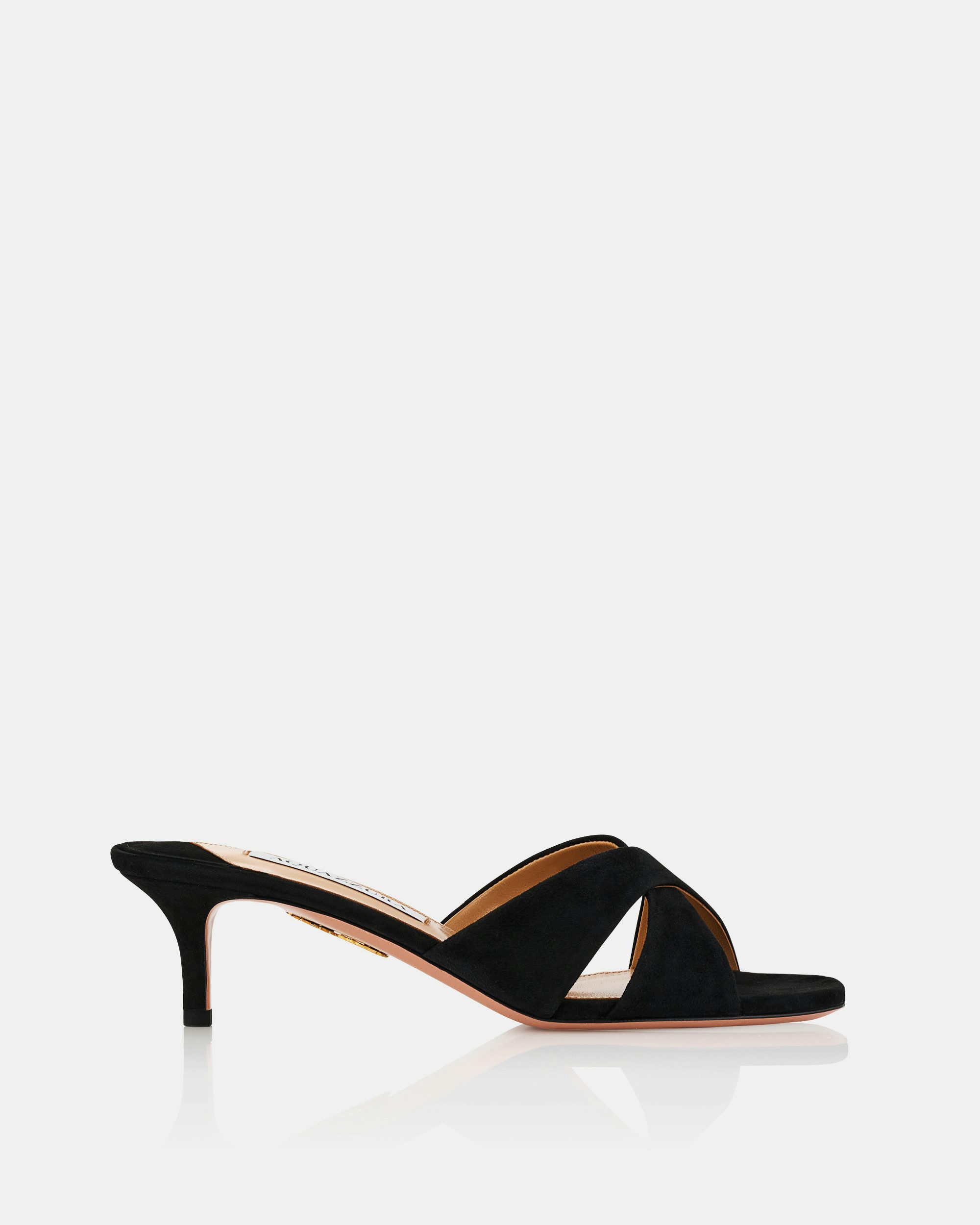 Pared-back and refined – the Divine Mules have a streamlined profile and chic 50 mm heels, so they work with a variety of outfits. Theyre crafted from velvety-soft black suede with wide crossover straps to secure your foot and comfortable cushioned leather insoles.